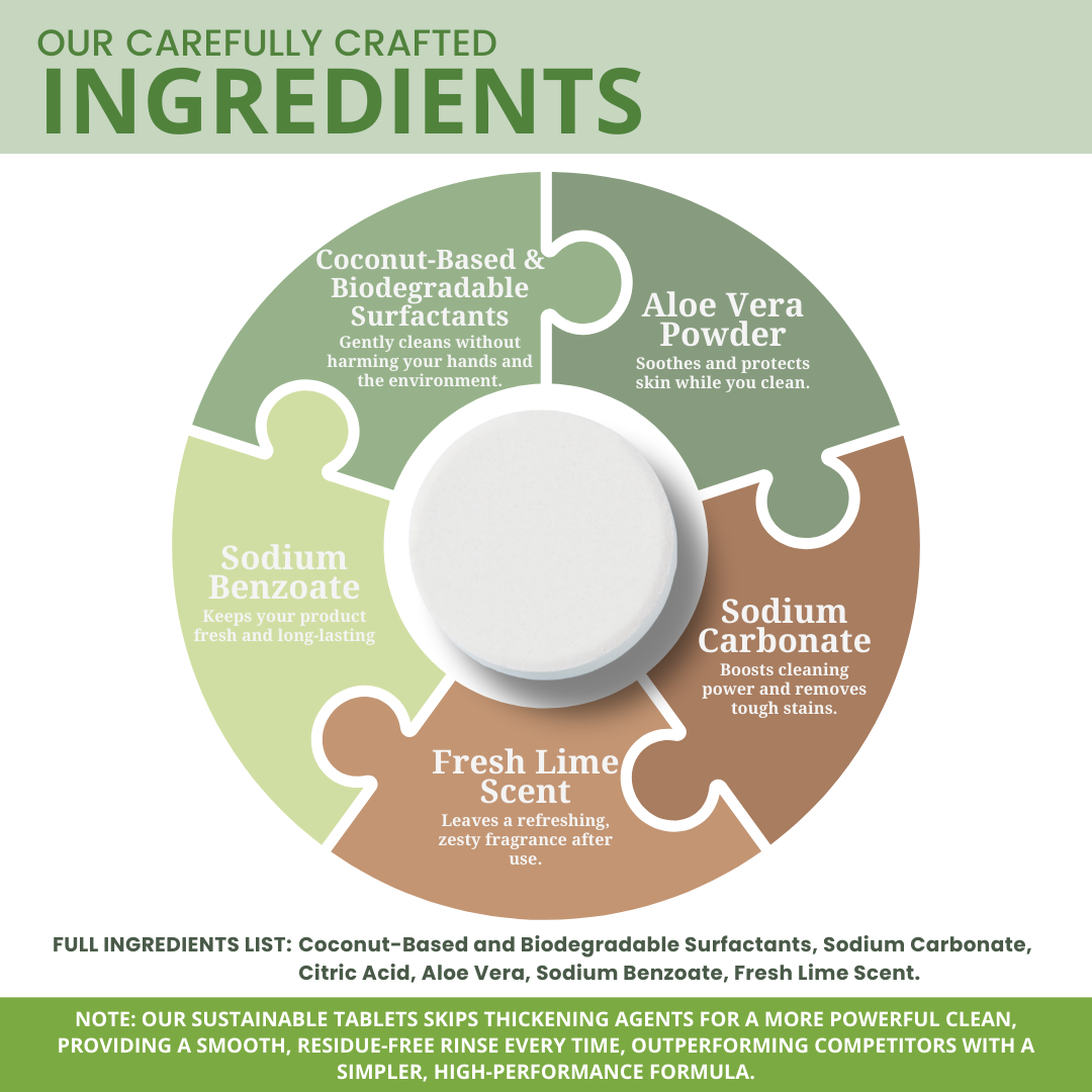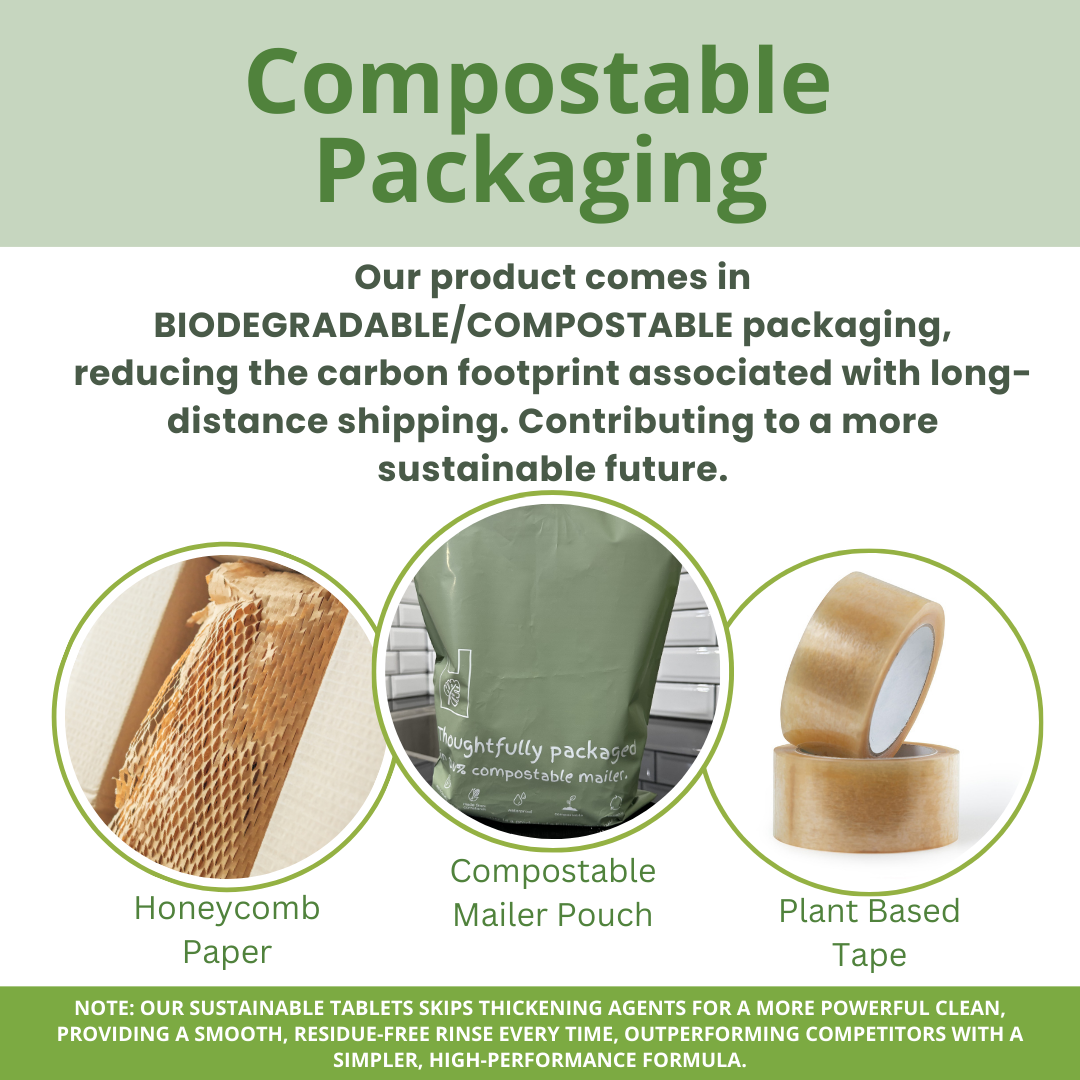 Say goodbye to plastic waste with our compostable packaging, and enjoy the convenience of pre-measured tablets that dissolve within minutes, delivering sparkling clean dishes every time.