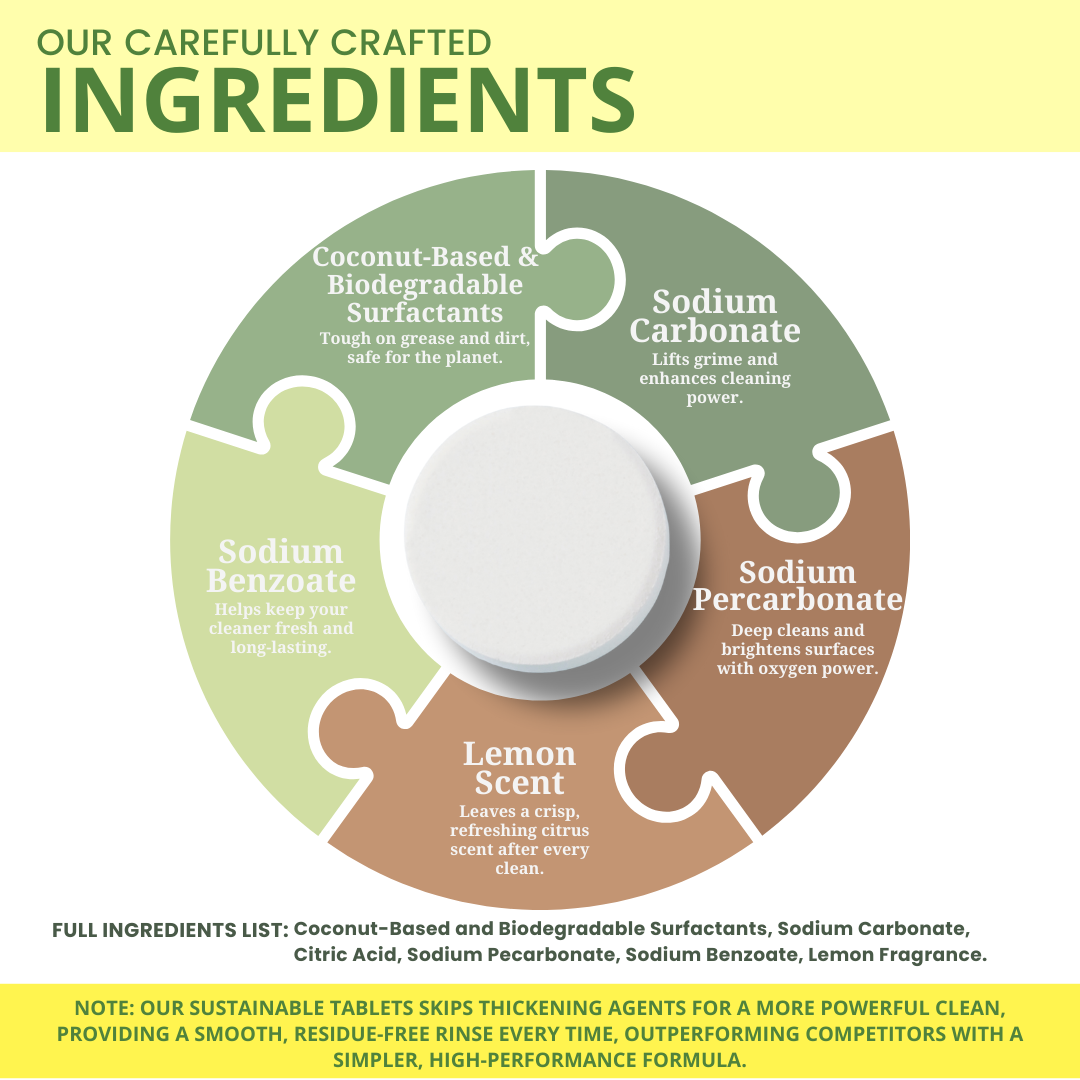 Eco-Friendly Formula: Made with natural, biodegradable ingredients, our tablets deliver exceptional cleaning performance while being kind to the environment.