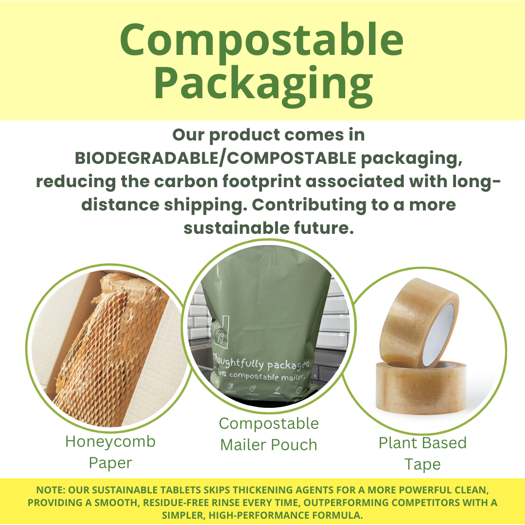 Say goodbye to plastic waste with our compostable packaging, and enjoy the convenience of pre-measured tablets that dissolve within minutes, delivering sparkling clean dishes every time.